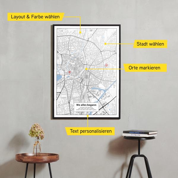 Jede Stadtkarte wird individuell gestaltet, um eine persönliche Geschichte zu erzählen. Mit der Möglichkeit, Marker zu setzen, hebst du die bedeutendsten Orte hervor und gibst dem Poster eine tiefe, persönliche Note. Wähle eigene Farben und Texte, um das Geschenk noch persönlicher zu gestalten. Eine solche Karte ist nicht nur eine wunderschöne Dekoration, sondern auch ein Zeichen tiefer Verbundenheit und Wertschätzung.