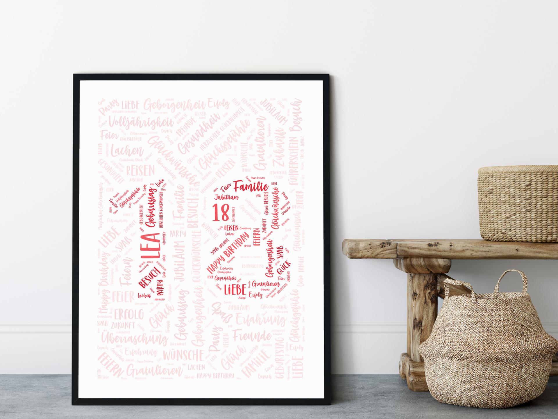 Das perfekte Geschenk zum Geburtstag. Wähle deine persönlichen Wörter und Glückwünsche und gestalte ein Kunstwerk mit dem Alter des Geburtstagskindes. Wähle Text, Form und Farben. Perfekt geeignet als Geschenk.