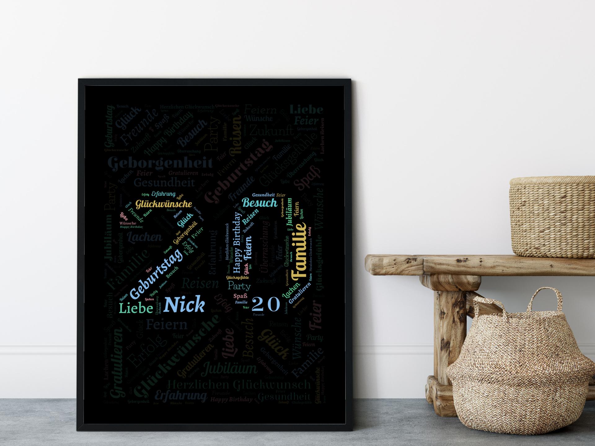 Das perfekte Geschenk zum Geburtstag. Wähle deine persönlichen Wörter und Glückwünsche und gestalte ein Kunstwerk mit dem Alter des Geburtstagskindes. Wähle Text, Form und Farben. Perfekt geeignet als Geschenk.