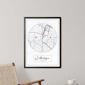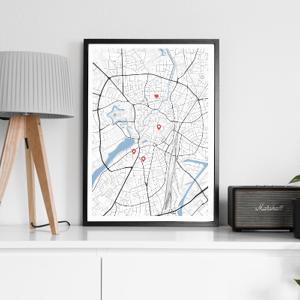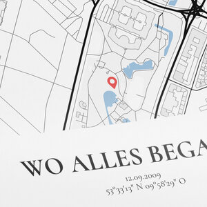 Alle unsere Bilder werden nach deinen Wünschen erstellt. Markiere die wichtigsten Orte. Du kannst selbstverständlich Texte, Widmungen und Koordinaten angeben. Auch alle Farben können nach deinen Vorstellungen gewählt werden. Du entscheidest, ob wir Gebäude, Straßen oder Beschriftungen darstellen.