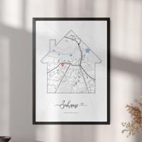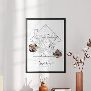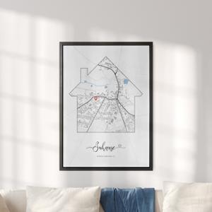 Ein neues Heim, ein neues Glück. Das perfekte Geschenk zum Umzug, Eigenheim, Einweihung oder Richtfest. Jeder Ort ist möglich. Markieren die neue Adresse und andere wichtige Orte. Einfach den Ort eingeben und nach deinen Wünschen personalisieren.