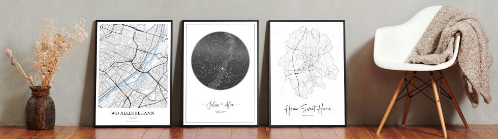 Unsere Kunstwerke halten die besonderen Momente fest: der Himmel zur Trauung, die Karte vom ersten Zuhause, die Sterne zur Geburt, der Ort, an dem alles begann. Gestaltet in wenigen Minuten. Zum Verschenken oder für dich.