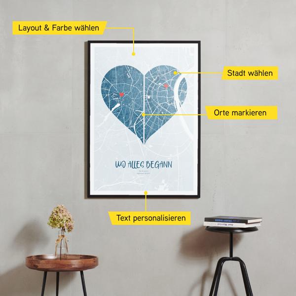 Das erste Treffen, die gemeinsame Wohnung, der Ort der Verlobung oder der Trauung. Zeige die wichtigsten Orte des Brautpaares. Das ideale Geschenk zur Verlobung, Hochzeit oder Jahrestag. Einfach den Ort eingeben und nach deinen Wünschen personalisieren.