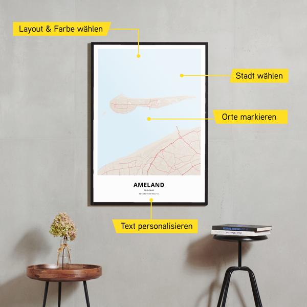 Wähle Farben und Layouts, die perfekt zu dir passen. Ob als klassische Karte in schwarz-weiß oder in modernen Farben. Bei Cartida kannst du ein Design in deinen Lieblingsfarben wählen. Erstelle eine Variante von Ameland - Deine Insel, die perfekt zu dir und deiner Wohnung passt.