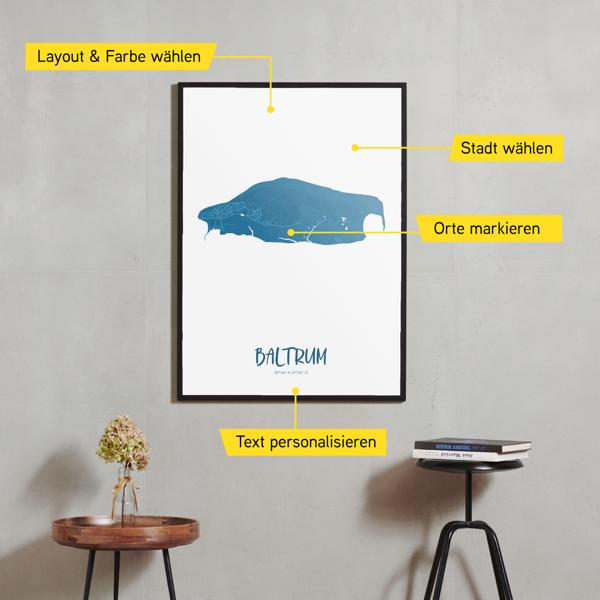 Wähle Farben und Layouts, die perfekt zu dir passen. Ob als klassische Karte in schwarz-weiß oder in modernen Farben. Bei Cartida kannst du ein Design in deinen Lieblingsfarben wählen. Erstelle eine Variante von Baltrum - Deine Insel, die perfekt zu dir und deiner Wohnung passt.
