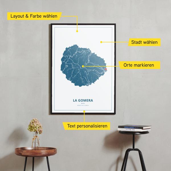 Wähle Farben und Layouts, die perfekt zu dir passen. Ob als klassische Karte in schwarz-weiß oder in modernen Farben. Bei Cartida kannst du ein Design in deinen Lieblingsfarben wählen. Erstelle eine Variante von La Gomera - Deine Insel, die perfekt zu dir und deiner Wohnung passt.