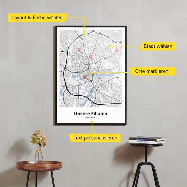 Gestalte ein persönliches Poster zum Firmenjubiläum. Markiere alle Standorte. Füge mit einer Widmung deine persönlichen Glückwünsche hinzu. Einfach den Ort eingeben und nach deinen Wünschen personalisieren.