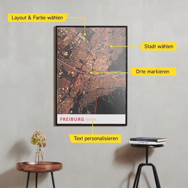 Alle unsere Bilder werden nach deinen Wünschen erstellt. Markiere die wichtigsten Orte. Du kannst selbstverständlich Texte, Widmungen und Koordinaten angeben. Auch alle Farben können nach deinen Vorstellungen gewählt werden. Du entscheidest, ob wir Gebäude, Straßen oder Beschriftungen darstellen.