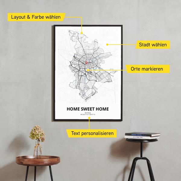 Wähle Farben und Layouts, die perfekt zu dir passen. Ob als klassische Karte in schwarz-weiß oder in modernen Farben. Bei Cartida kannst du ein Design in deinen Lieblingsfarben wählen. Erstelle eine Variante von Home Sweet Home - Deine Stadt - Deine Heimat, die perfekt zu dir und deiner Wohnung passt.