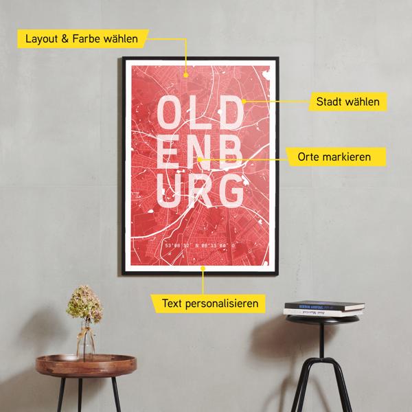 Alle unsere Bilder werden nach deinen Wünschen erstellt. Markiere die wichtigsten Orte. Du kannst selbstverständlich Texte, Widmungen und Koordinaten angeben. Auch alle Farben können nach deinen Vorstellungen gewählt werden. Du entscheidest, ob wir Gebäude, Straßen oder Beschriftungen darstellen.