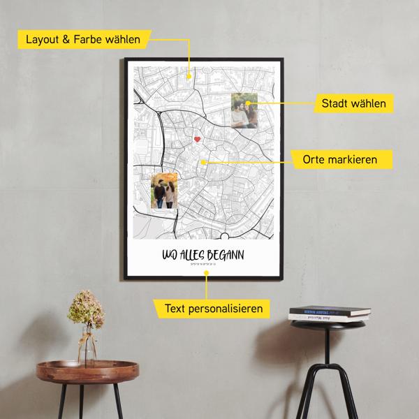 Verewige eure Liebe mit einer personalisierten Stadtkarte von Cartida, die zeigt, „Wo alles begann“. Diese personalisierte Karte zeichnet die Anfänge eurer Beziehung nach und markiert den Ort, an dem eure gemeinsame Geschichte ihren Anfang nahm. Es ist ein einzigartiges Zeugnis eurer Liebe, das die besondere Verbindung zwischen euch auf eine kreative und bedeutungsvolle Weise zum Ausdruck bringt.