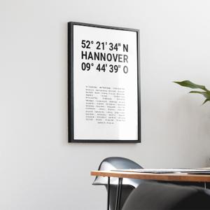 Zahlen, die die Welt bedeuten. Erstelle jetzt dein persönliches Koordinaten-Kunstwerk von deiner Lieblingsstadt. Entscheide selbst, ob Stadtteile, Straßen oder ganz eigene Texte abgedruckt werden. Perfekt als Geschenk zum Einzug oder für die eigenen vier Wände.