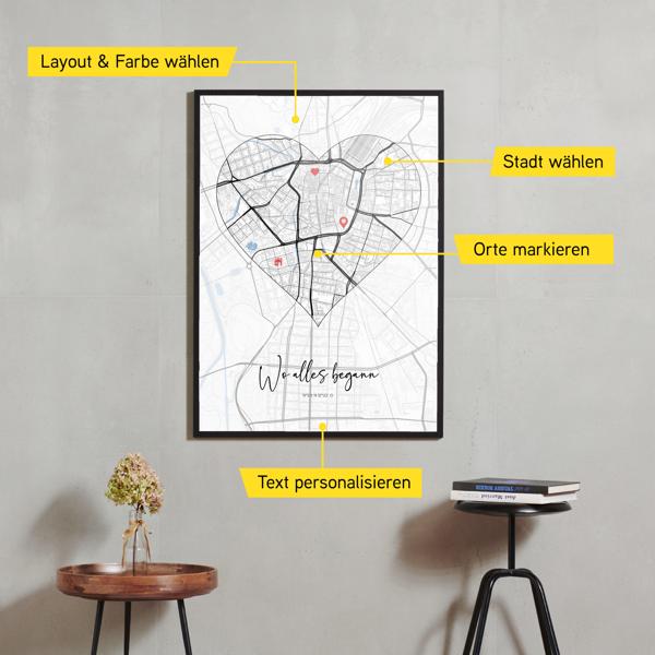 Mache jede Gelegenheit zu etwas Besonderem mit einem maßgeschneiderten Stadtkarten-Poster von Cartida. Ob als Geschenk zum Einzug, zur Hochzeit oder einfach als eine schöne Erinnerung für dich selbst – markiere bedeutsame Orte und verleihe dem Ganzen eine persönliche Note. Unsere hochwertigen Poster bieten nicht nur eine einzigartige Möglichkeit, deine Verbundenheit mit bestimmten Orten auszudrücken, sondern auch ein stilvolles Element für jede Raumdekoration.