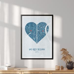 Wähle Farben und Layouts, die perfekt zu dir passen. Ob als klassische Karte in schwarz-weiß oder in modernen Farben. Bei Cartida kannst du ein Design in deinen Lieblingsfarben wählen. Erstelle eine Variante von Wo alles begann Stadtkarte, die perfekt zu dir und deiner Wohnung passt.