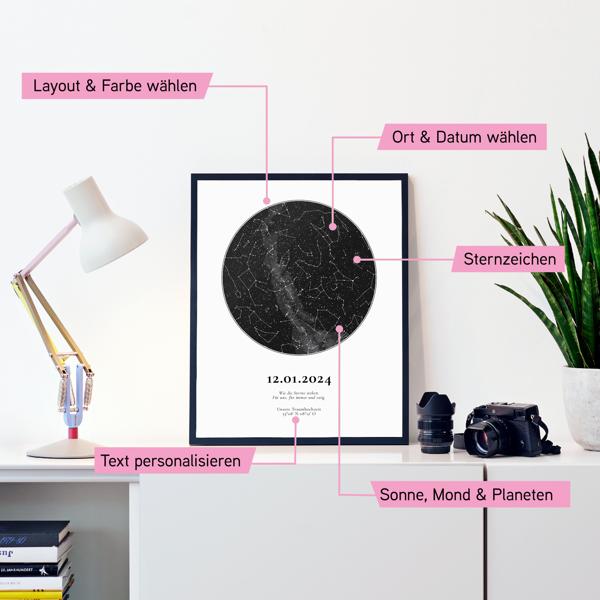Wähle Farben und Layout von deinem Sternenhimmel die perfekt zu dir und deiner Wohnung passen. Unsere Produkte werden 100% individuell für dich erstellt und werden von uns in Deutschland gedruckt.
