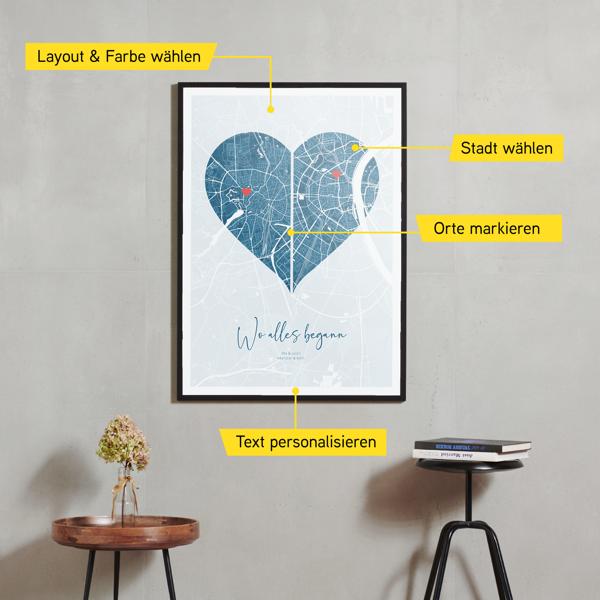 Zeige die wichtigsten Orte Deiner Liebe. Ideal als Geschenk zum Valentinstag oder Jahrestag. Einfach den Ort eingeben und nach deinen Wünschen personalisieren.