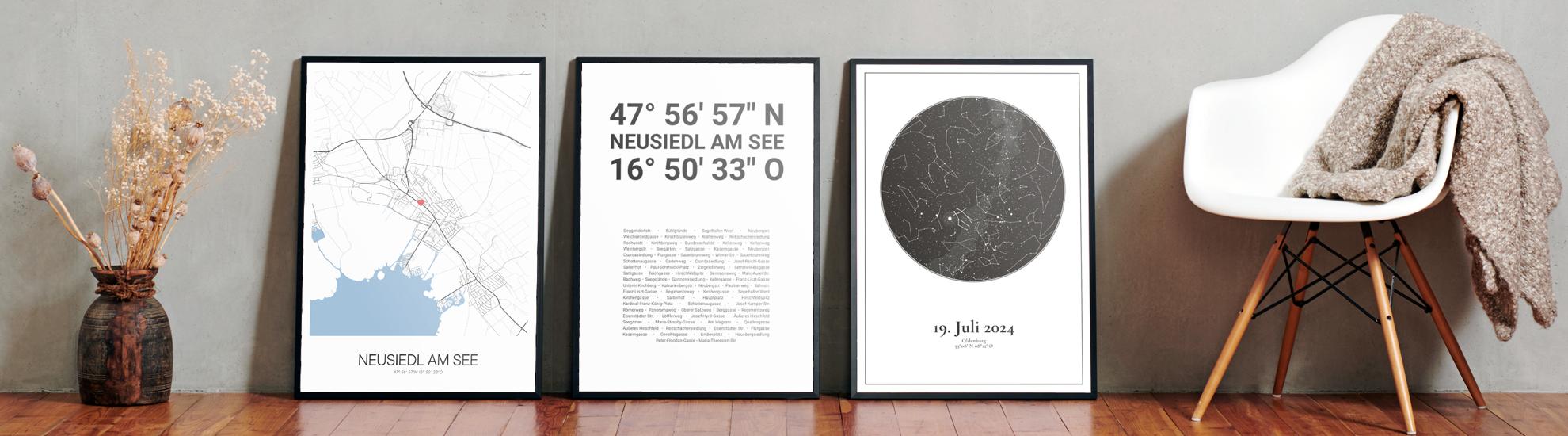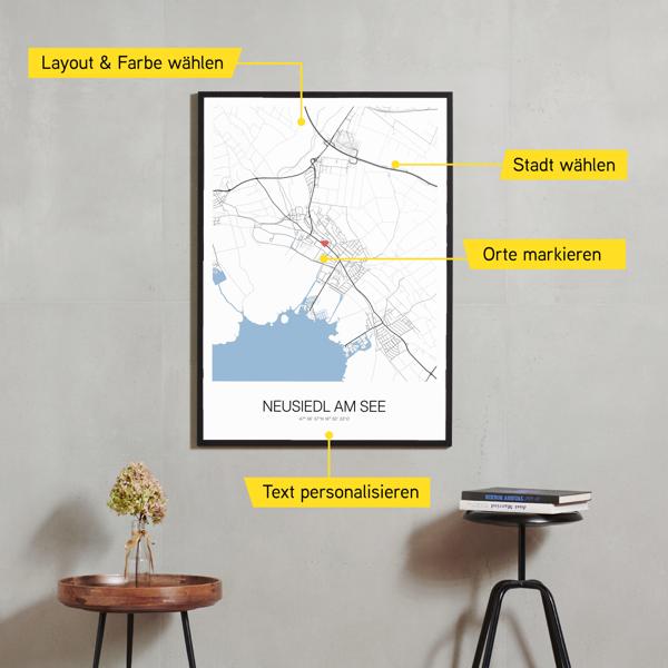 Wähle Farben und Layouts, die perfekt zu dir passen. Ob als klassische Karte in schwarz-weiß oder in modernen Farben. Bei Cartida kannst du ein Design in deinen Lieblingsfarben wählen. Erstelle eine Variante von Neusiedl am See, die perfekt zu dir und deiner Wohnung passt.