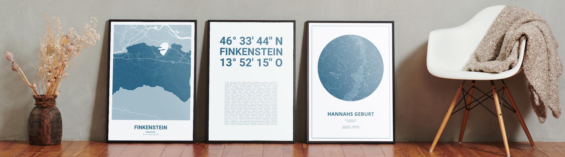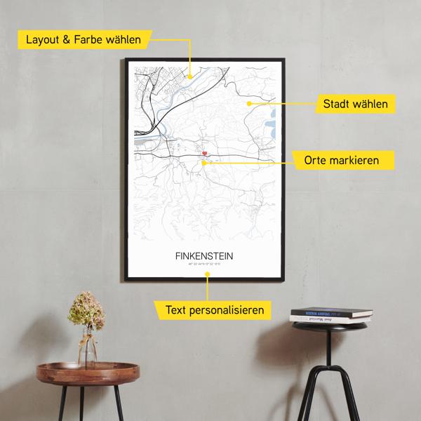 Wähle Farben und Layouts, die perfekt zu dir passen. Ob als klassische Karte in schwarz-weiß oder in modernen Farben. Bei Cartida kannst du ein Design in deinen Lieblingsfarben wählen. Erstelle eine Variante von Finkenstein, die perfekt zu dir und deiner Wohnung passt.