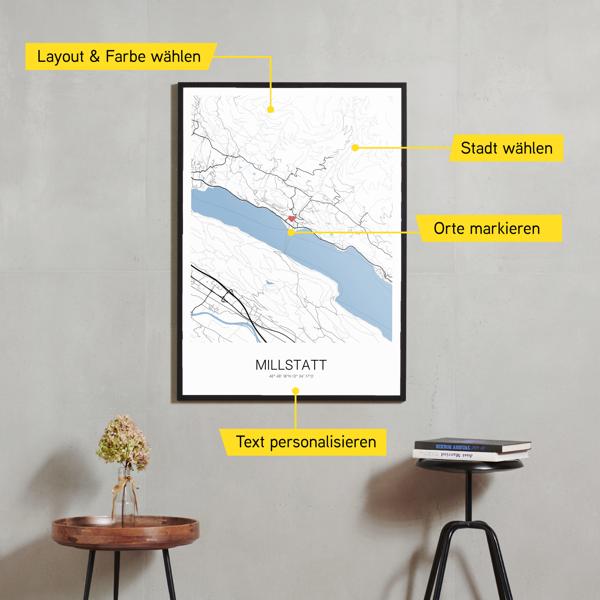 Wähle Farben und Layouts, die perfekt zu dir passen. Ob als klassische Karte in schwarz-weiß oder in modernen Farben. Bei Cartida kannst du ein Design in deinen Lieblingsfarben wählen. Erstelle eine Variante von Millstatt, die perfekt zu dir und deiner Wohnung passt.