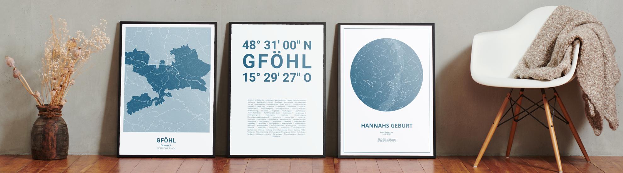 Wähle Farben und Layouts, die perfekt zu dir passen. Ob als klassische Karte in schwarz-weiß oder in modernen Farben. Bei Cartida kannst du ein Design in deinen Lieblingsfarben wählen. Erstelle eine Variante von Gföhl, die perfekt zu dir und deiner Wohnung passt.