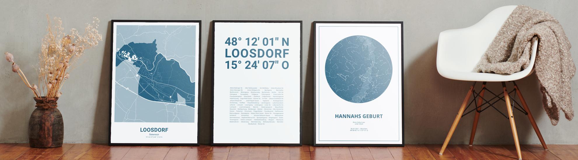 Wähle Farben und Layouts, die perfekt zu dir passen. Ob als klassische Karte in schwarz-weiß oder in modernen Farben. Bei Cartida kannst du ein Design in deinen Lieblingsfarben wählen. Erstelle eine Variante von Loosdorf, die perfekt zu dir und deiner Wohnung passt.