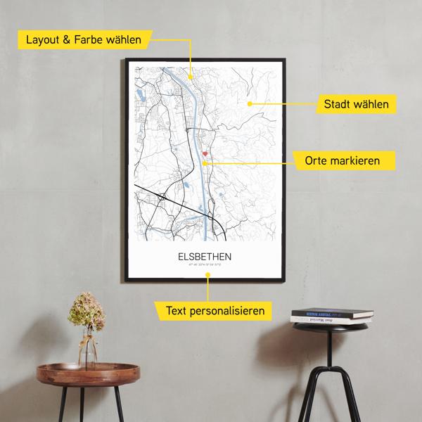 Wähle Farben und Layouts, die perfekt zu dir passen. Ob als klassische Karte in schwarz-weiß oder in modernen Farben. Bei Cartida kannst du ein Design in deinen Lieblingsfarben wählen. Erstelle eine Variante von Elsbethen, die perfekt zu dir und deiner Wohnung passt.