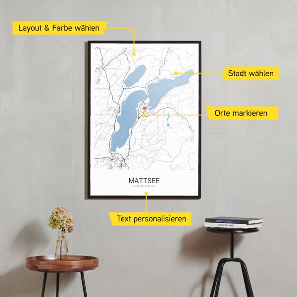 Wähle Farben und Layouts, die perfekt zu dir passen. Ob als klassische Karte in schwarz-weiß oder in modernen Farben. Bei Cartida kannst du ein Design in deinen Lieblingsfarben wählen. Erstelle eine Variante von Mattsee, die perfekt zu dir und deiner Wohnung passt.