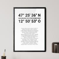 Zahlen, die die Welt bedeuten. Erstelle jetzt dein persönliches Koordinaten-Kunstwerk von deiner Lieblingsstadt. Entscheide selbst, ob Stadtteile, Straßen oder ganz eigene Texte abgedruckt werden. Perfekt als Geschenk zum Einzug oder für die eigenen vier Wände.