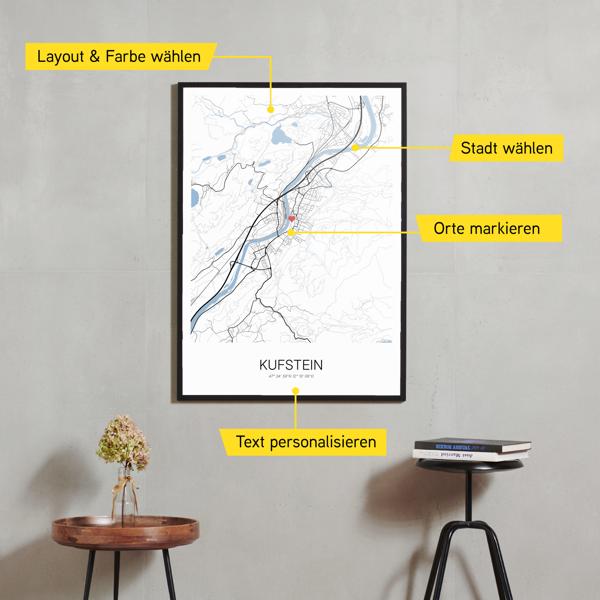 Wähle Farben und Layouts, die perfekt zu dir passen. Ob als klassische Karte in schwarz-weiß oder in modernen Farben. Bei Cartida kannst du ein Design in deinen Lieblingsfarben wählen. Erstelle eine Variante von Kufstein, die perfekt zu dir und deiner Wohnung passt.