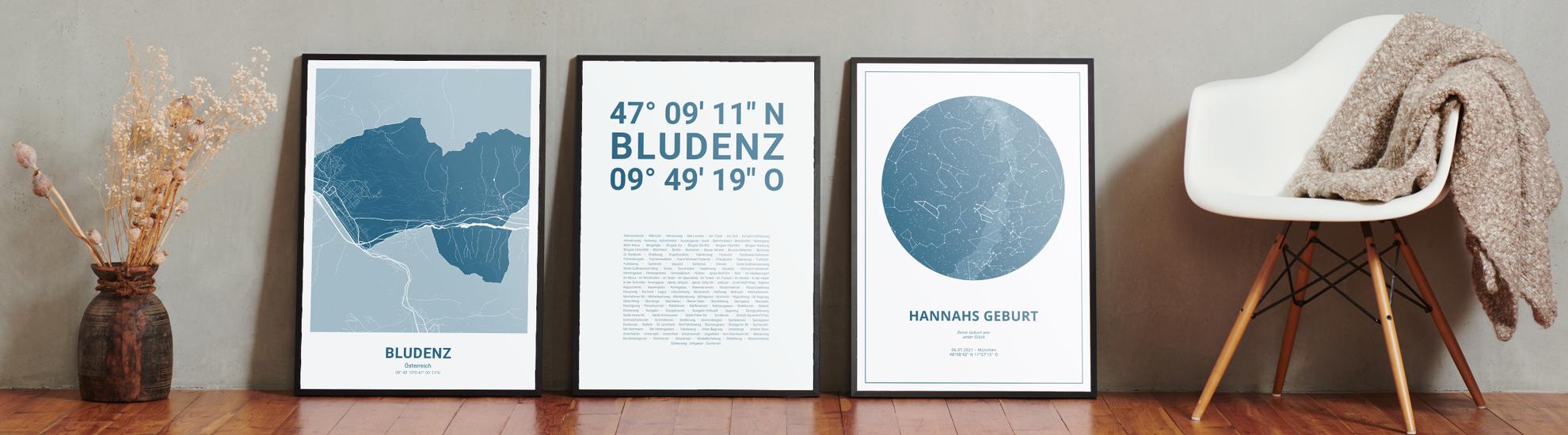 Wähle Farben und Layouts, die perfekt zu dir passen. Ob als klassische Karte in schwarz-weiß oder in modernen Farben. Bei Cartida kannst du ein Design in deinen Lieblingsfarben wählen. Erstelle eine Variante von Bludenz, die perfekt zu dir und deiner Wohnung passt.