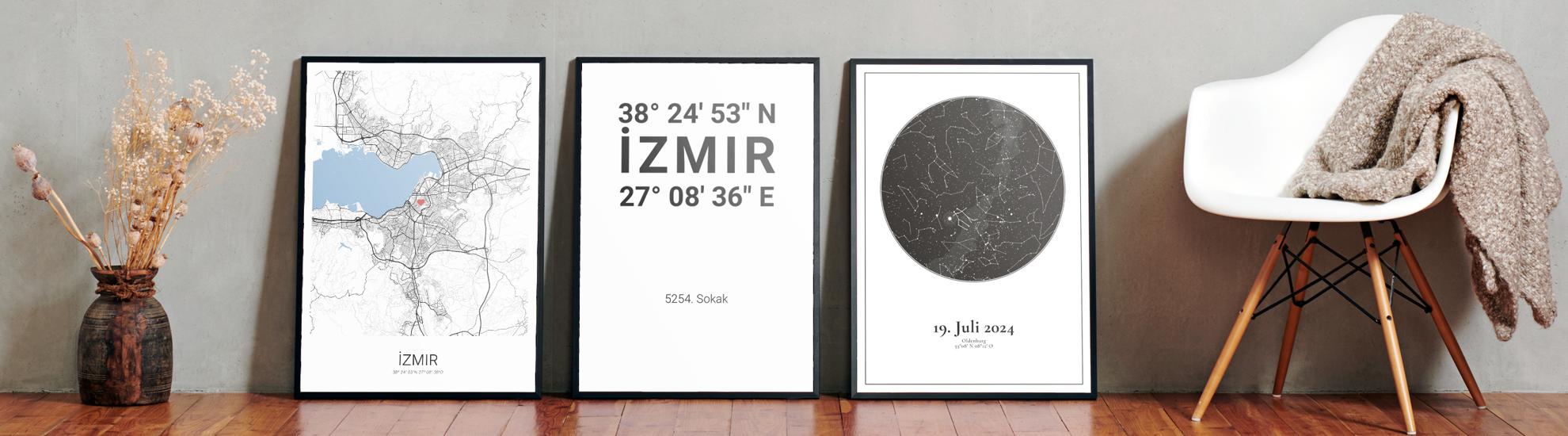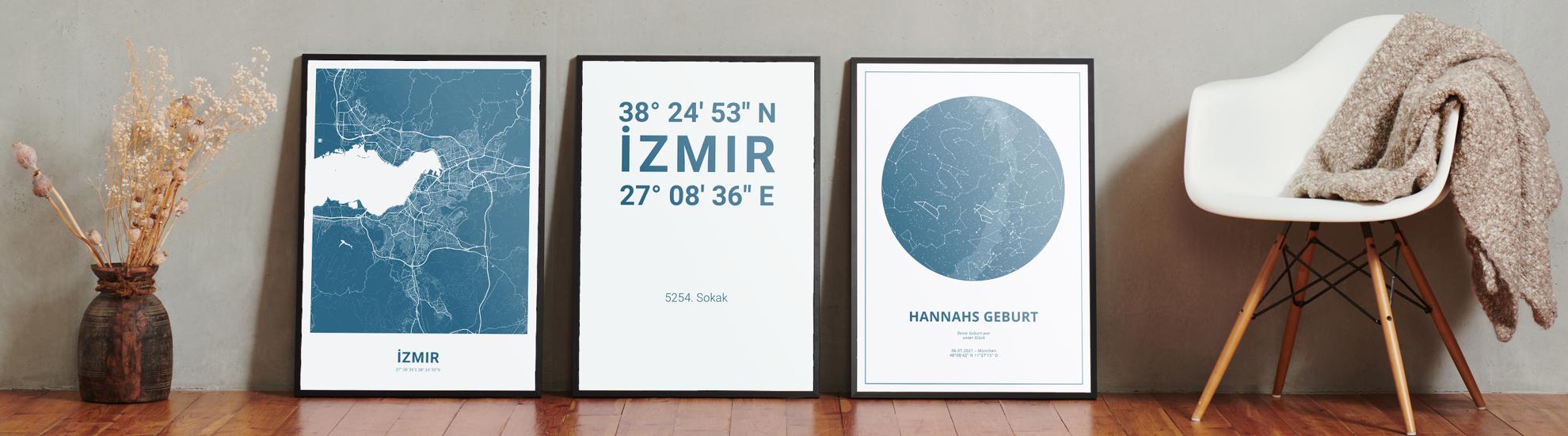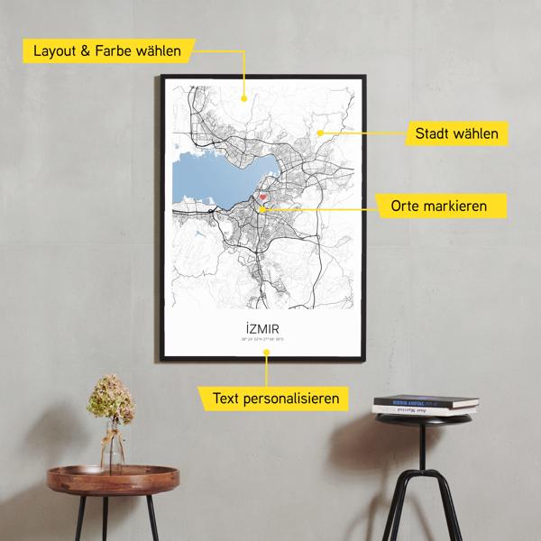 Wähle Farben und Layouts, die perfekt zu dir passen. Ob als klassische Karte in schwarz-weiß oder in modernen Farben. Bei Cartida kannst du ein Design in deinen Lieblingsfarben wählen. Erstelle eine Variante von İzmir, die perfekt zu dir und deiner Wohnung passt.
