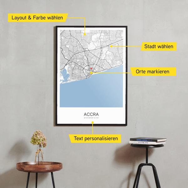 Wähle Farben und Layouts, die perfekt zu dir passen. Ob als klassische Karte in schwarz-weiß oder in modernen Farben. Bei Cartida kannst du ein Design in deinen Lieblingsfarben wählen. Erstelle eine Variante von Accra, die perfekt zu dir und deiner Wohnung passt.