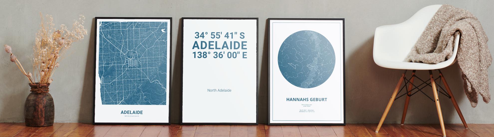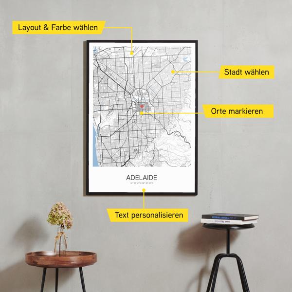 Wähle Farben und Layouts, die perfekt zu dir passen. Ob als klassische Karte in schwarz-weiß oder in modernen Farben. Bei Cartida kannst du ein Design in deinen Lieblingsfarben wählen. Erstelle eine Variante von Adelaide, die perfekt zu dir und deiner Wohnung passt.