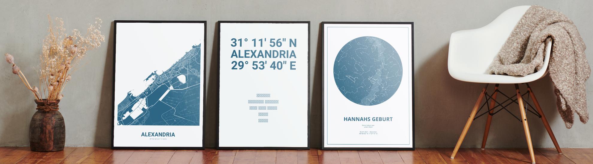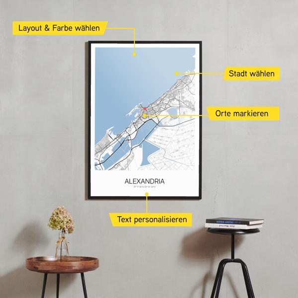 Wähle Farben und Layouts, die perfekt zu dir passen. Ob als klassische Karte in schwarz-weiß oder in modernen Farben. Bei Cartida kannst du ein Design in deinen Lieblingsfarben wählen. Erstelle eine Variante von Alexandria, die perfekt zu dir und deiner Wohnung passt.