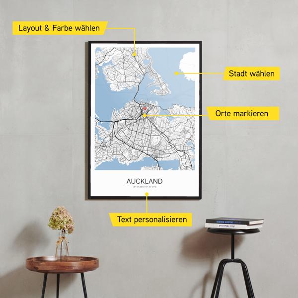 Wähle Farben und Layouts, die perfekt zu dir passen. Ob als klassische Karte in schwarz-weiß oder in modernen Farben. Bei Cartida kannst du ein Design in deinen Lieblingsfarben wählen. Erstelle eine Variante von Auckland, die perfekt zu dir und deiner Wohnung passt.