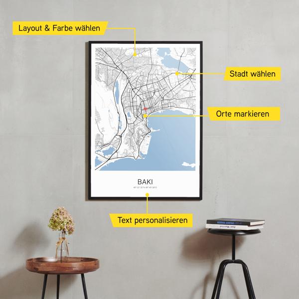 Wähle Farben und Layouts, die perfekt zu dir passen. Ob als klassische Karte in schwarz-weiß oder in modernen Farben. Bei Cartida kannst du ein Design in deinen Lieblingsfarben wählen. Erstelle eine Variante von Bakı, die perfekt zu dir und deiner Wohnung passt.
