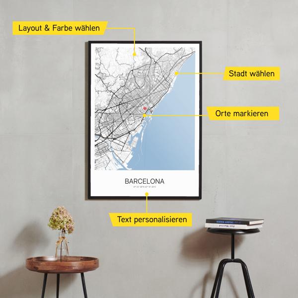Wähle Farben und Layouts, die perfekt zu dir passen. Ob als klassische Karte in schwarz-weiß oder in modernen Farben. Bei Cartida kannst du ein Design in deinen Lieblingsfarben wählen. Erstelle eine Variante von Barcelona, die perfekt zu dir und deiner Wohnung passt.