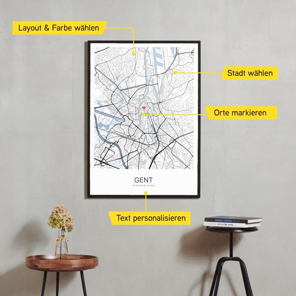 Wähle Farben und Layouts, die perfekt zu dir passen. Ob als klassische Karte in schwarz-weiß oder in modernen Farben. Bei Cartida kannst du ein Design in deinen Lieblingsfarben wählen. Erstelle eine Variante von Gent, die perfekt zu dir und deiner Wohnung passt.
