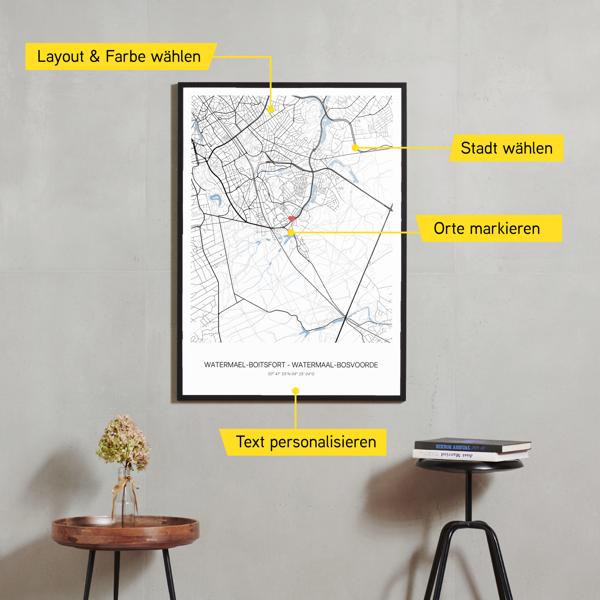 Wähle Farben und Layouts, die perfekt zu dir passen. Ob als klassische Karte in schwarz-weiß oder in modernen Farben. Bei Cartida kannst du ein Design in deinen Lieblingsfarben wählen. Erstelle eine Variante von Watermael-Boitsfort - Watermaal-Bosvoorde, die perfekt zu dir und deiner Wohnung passt.