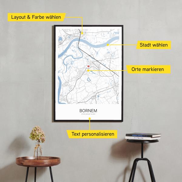Wähle Farben und Layouts, die perfekt zu dir passen. Ob als klassische Karte in schwarz-weiß oder in modernen Farben. Bei Cartida kannst du ein Design in deinen Lieblingsfarben wählen. Erstelle eine Variante von Bornem, die perfekt zu dir und deiner Wohnung passt.
