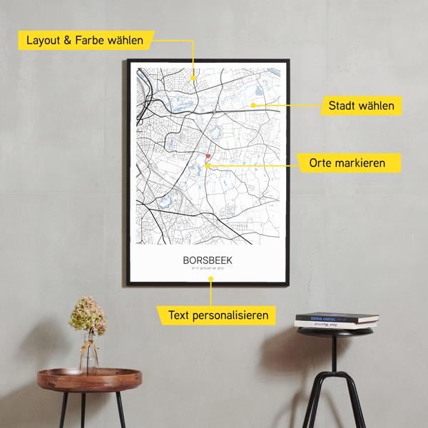 Wähle Farben und Layouts, die perfekt zu dir passen. Ob als klassische Karte in schwarz-weiß oder in modernen Farben. Bei Cartida kannst du ein Design in deinen Lieblingsfarben wählen. Erstelle eine Variante von Borsbeek, die perfekt zu dir und deiner Wohnung passt.