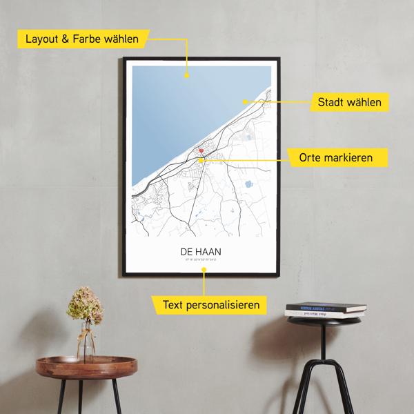 Wähle Farben und Layouts, die perfekt zu dir passen. Ob als klassische Karte in schwarz-weiß oder in modernen Farben. Bei Cartida kannst du ein Design in deinen Lieblingsfarben wählen. Erstelle eine Variante von De Haan, die perfekt zu dir und deiner Wohnung passt.