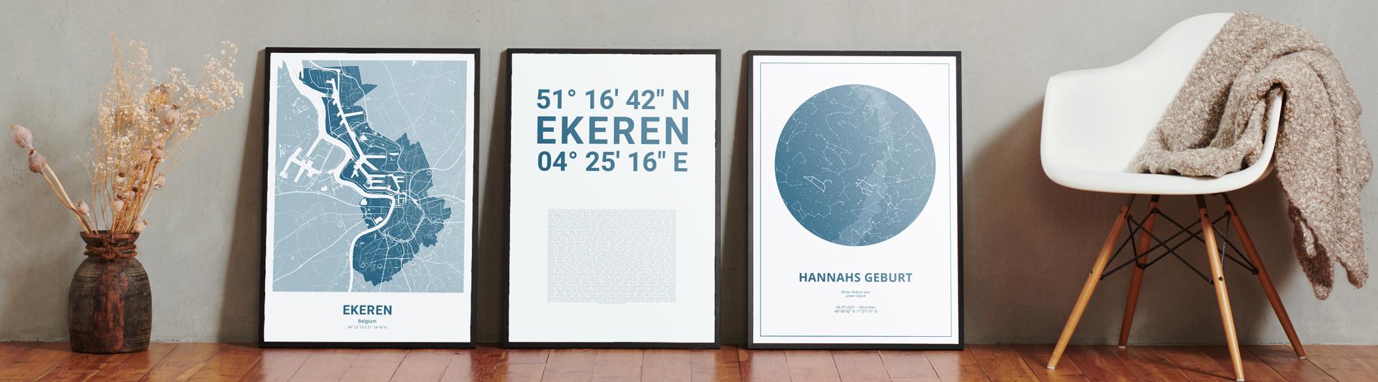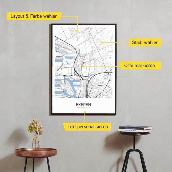 Wähle Farben und Layouts, die perfekt zu dir passen. Ob als klassische Karte in schwarz-weiß oder in modernen Farben. Bei Cartida kannst du ein Design in deinen Lieblingsfarben wählen. Erstelle eine Variante von Ekeren, die perfekt zu dir und deiner Wohnung passt.