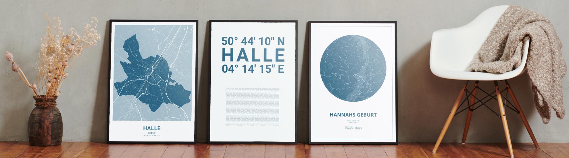 Wähle Farben und Layouts, die perfekt zu dir passen. Ob als klassische Karte in schwarz-weiß oder in modernen Farben. Bei Cartida kannst du ein Design in deinen Lieblingsfarben wählen. Erstelle eine Variante von Halle, die perfekt zu dir und deiner Wohnung passt.