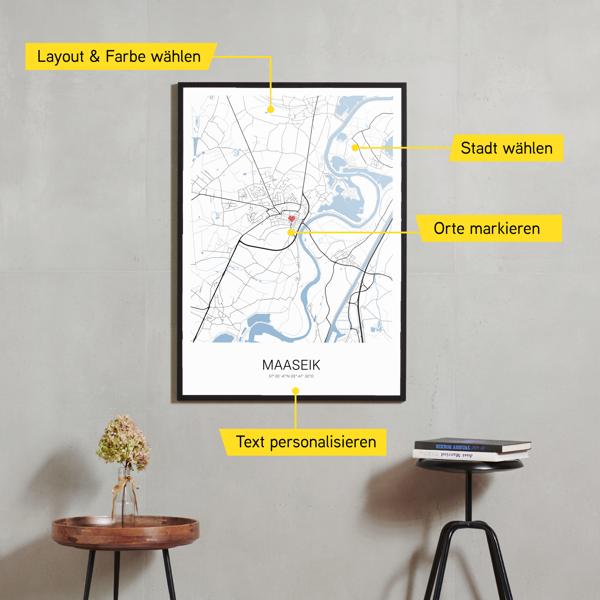 Wähle Farben und Layouts, die perfekt zu dir passen. Ob als klassische Karte in schwarz-weiß oder in modernen Farben. Bei Cartida kannst du ein Design in deinen Lieblingsfarben wählen. Erstelle eine Variante von Maaseik, die perfekt zu dir und deiner Wohnung passt.