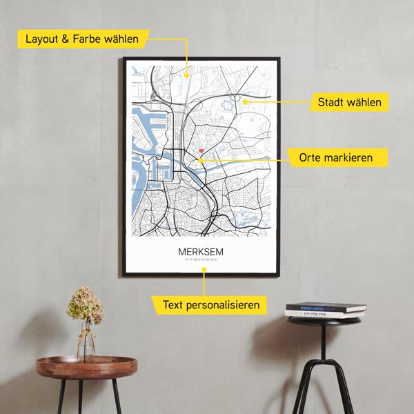 Wähle Farben und Layouts, die perfekt zu dir passen. Ob als klassische Karte in schwarz-weiß oder in modernen Farben. Bei Cartida kannst du ein Design in deinen Lieblingsfarben wählen. Erstelle eine Variante von Merksem, die perfekt zu dir und deiner Wohnung passt.