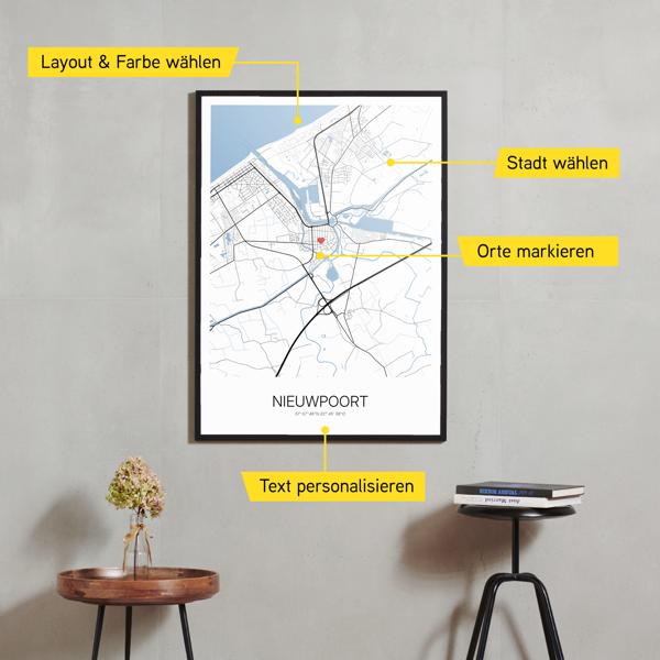 Wähle Farben und Layouts, die perfekt zu dir passen. Ob als klassische Karte in schwarz-weiß oder in modernen Farben. Bei Cartida kannst du ein Design in deinen Lieblingsfarben wählen. Erstelle eine Variante von Nieuwpoort, die perfekt zu dir und deiner Wohnung passt.