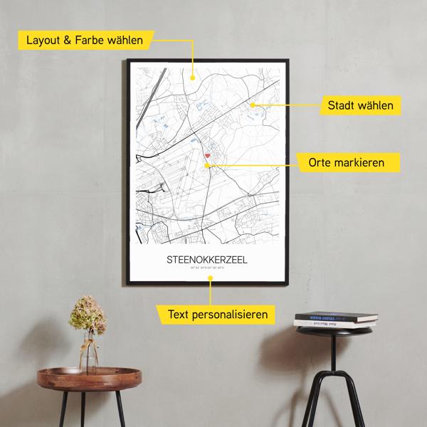 Wähle Farben und Layouts, die perfekt zu dir passen. Ob als klassische Karte in schwarz-weiß oder in modernen Farben. Bei Cartida kannst du ein Design in deinen Lieblingsfarben wählen. Erstelle eine Variante von Steenokkerzeel, die perfekt zu dir und deiner Wohnung passt.