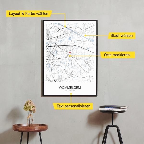 Wähle Farben und Layouts, die perfekt zu dir passen. Ob als klassische Karte in schwarz-weiß oder in modernen Farben. Bei Cartida kannst du ein Design in deinen Lieblingsfarben wählen. Erstelle eine Variante von Wommelgem, die perfekt zu dir und deiner Wohnung passt.