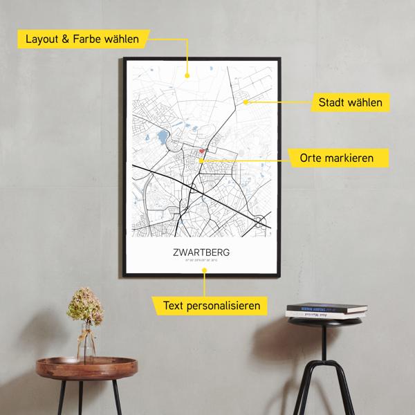 Wähle Farben und Layouts, die perfekt zu dir passen. Ob als klassische Karte in schwarz-weiß oder in modernen Farben. Bei Cartida kannst du ein Design in deinen Lieblingsfarben wählen. Erstelle eine Variante von Zwartberg, die perfekt zu dir und deiner Wohnung passt.